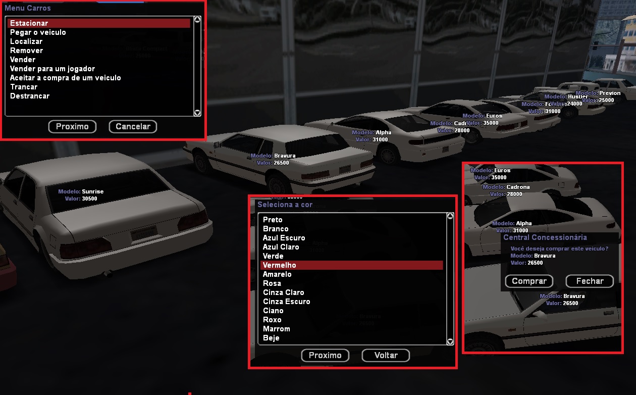 •> Veiculos são exposto ao publico para poder olhar, basta entra no veiculo para poder comprar, apos a seleção de cor, o jogador saira do veiculo e vai aparecer o outro veiculo cujo o comprador comprou no spawn