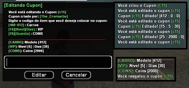 Sistema de criar Cupons in-game para ADMs, para setar Vips, carros, itens inventarios.. Consiste em, os ADM cria uma KEY, e configura o que vai ter de bonus na mesma, e passa para o jogador, assim que o jogador ativar a KEY, ela e deletada, e ele ganha os beneficios da KEY definada pelo ADM.