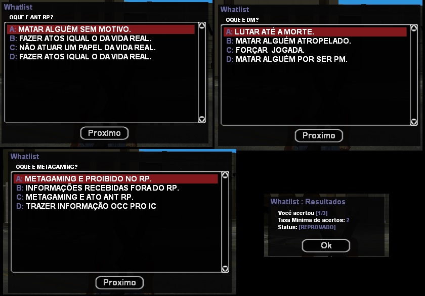 Sistema de WT (Whatlist) in-game, onde os jogadores responderam as perguntas definidas in-game, caso o candidato passar no teste e liberado para entrar no servidor, caso contrário o jogador serar kickado ou banido, seja como o dono do servidor quiser.